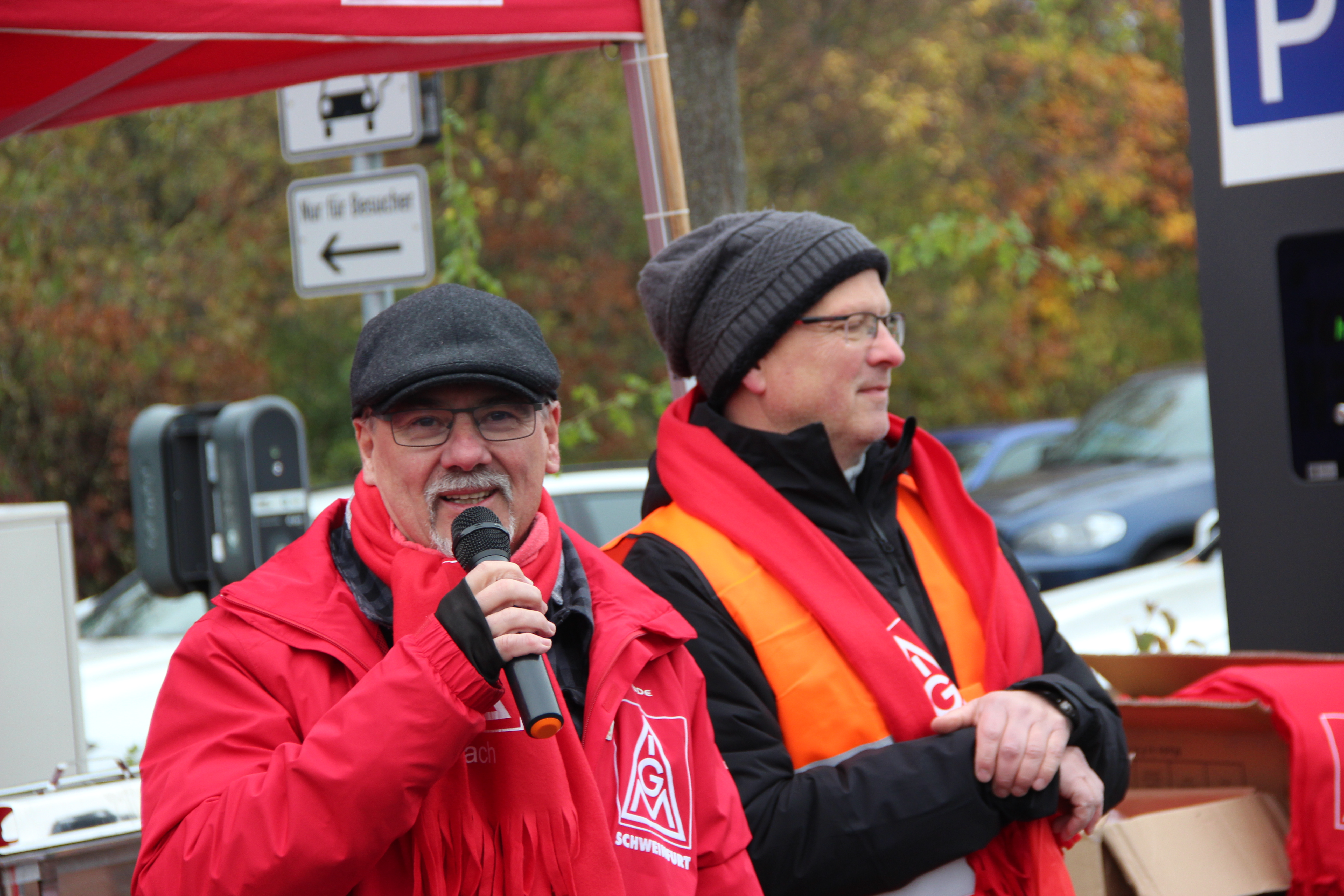 Etwa 100 Beschäftigte der Frühschicht legten für zwei Stunden die Arbeit nieder und beteiligten sich an der Warnstreikkundgebung vor dem Betrieb.
