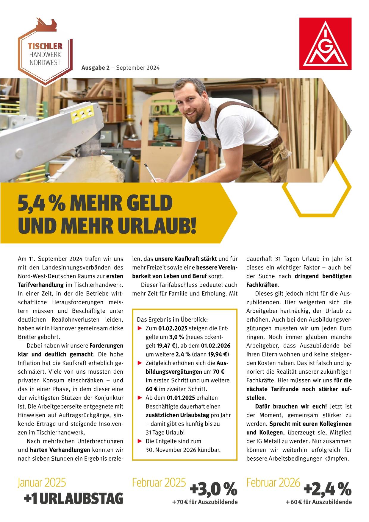 Zum 1. Februar 2026 steigen die tariflichen Entgelte im Tischlerhandwerk Nordwest um weitere 2,4 Prozent. Grundlage ist der Tarifabschluss vom Herbst 2024, den die IG Metall mit den Landesinnungen vereinbart hatte.
